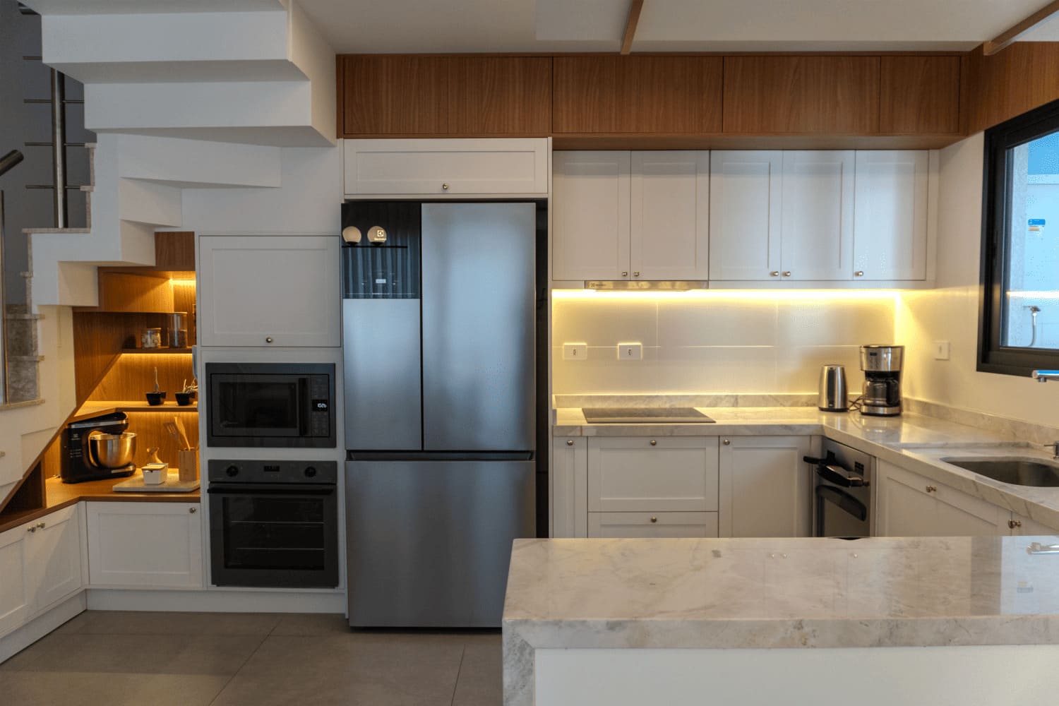 Eletrodomésticos embutidos, como geladeira, forno e micro-ondas, ajudam a manter a cozinha organizada e com um visual uniforme. Nossos projetos já incluem espaços planejados para esses itens.