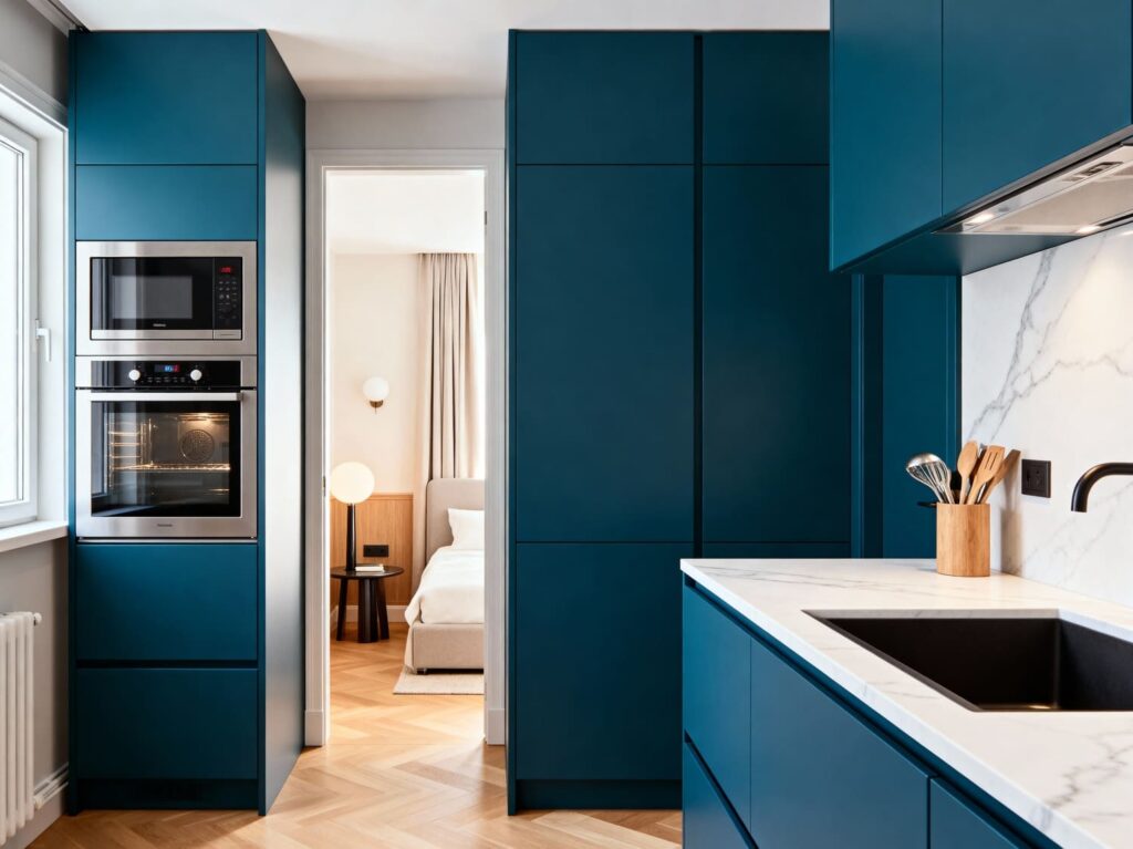 - Cozinha e Lavanderia Integradas: Em espaços compactos, a integração é a chave. Use armários planejados para embutir todos os eletrodomésticos (cooktop, forno, micro-ondas) e crie uma porta mimetizada para esconder a máquina de lavar, mantendo a estética limpa. Uma bancada única de quartzo ou granito pode unificar os dois ambientes de forma fluida.