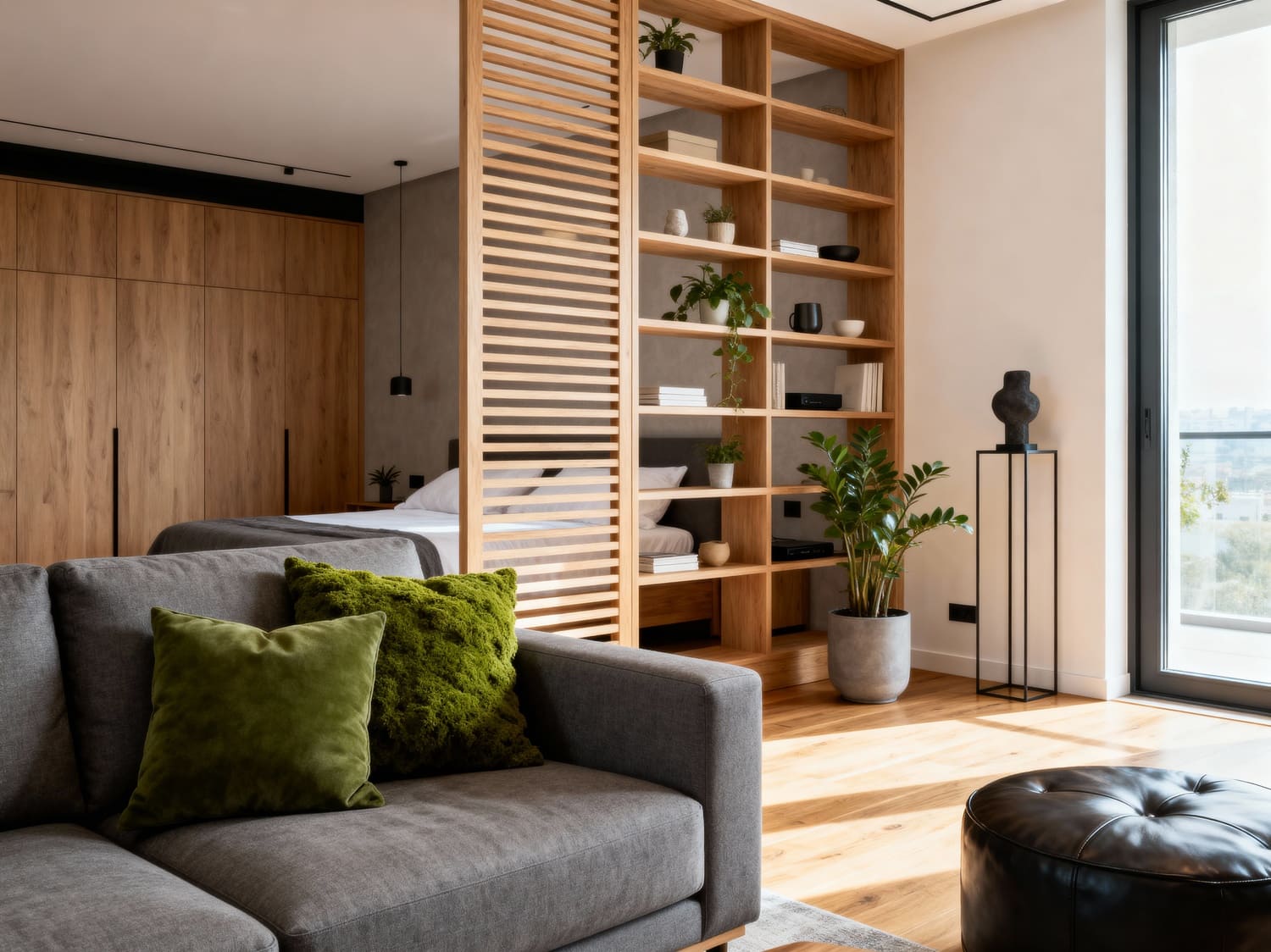 - Sala e Quarto (em Studios): Para dividir sem isolar, use elementos vazados. Estantes de metalon e madeira ou painéis ripados do chão ao teto delimitam o espaço do quarto, garantindo privacidade sem bloquear a luz natural. A cama pode ter uma cabeceira que se estende e se transforma em uma pequena escrivaninha, otimizando a área de dormir e trabalho.