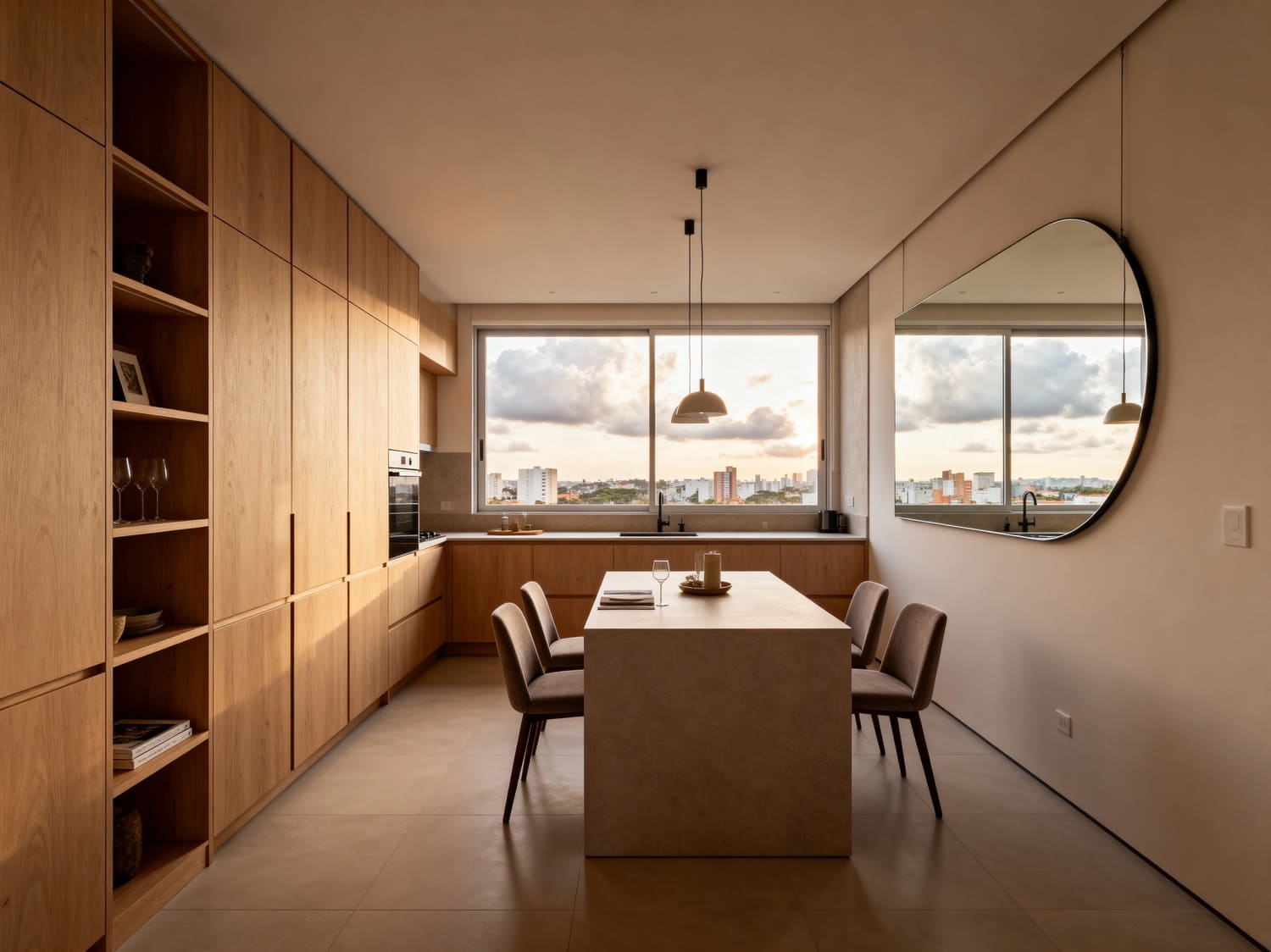 Na sala de jantar, um painel de espelho aplicado na parede ao lado da mesa cria uma “janela falsa”. Ao refletir a sala de estar ou a vista da varanda, ele quebra a sensação de “fim de parede” e traz uma profundidade imediata que alivia a sensação de aperto.