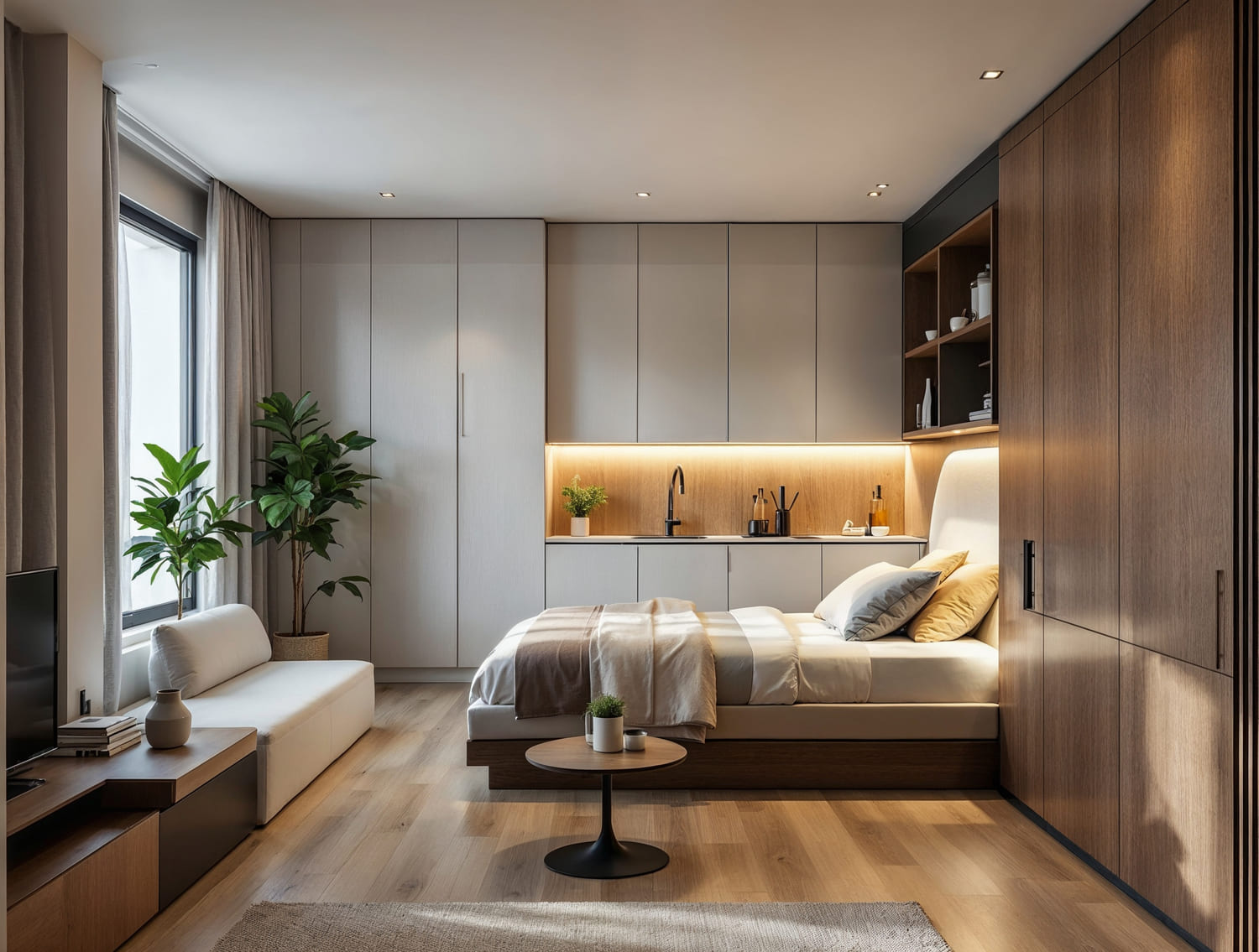 - Armários do Chão ao Teto: Esta é a regra de ouro para apartamentos studio. Aproveitar todo o pé-direito com armários na cozinha, no quarto e até no banheiro cria um espaço de armazenamento imenso para guardar tudo o que você precisa, desde roupas de outra estação até utensílios de cozinha.